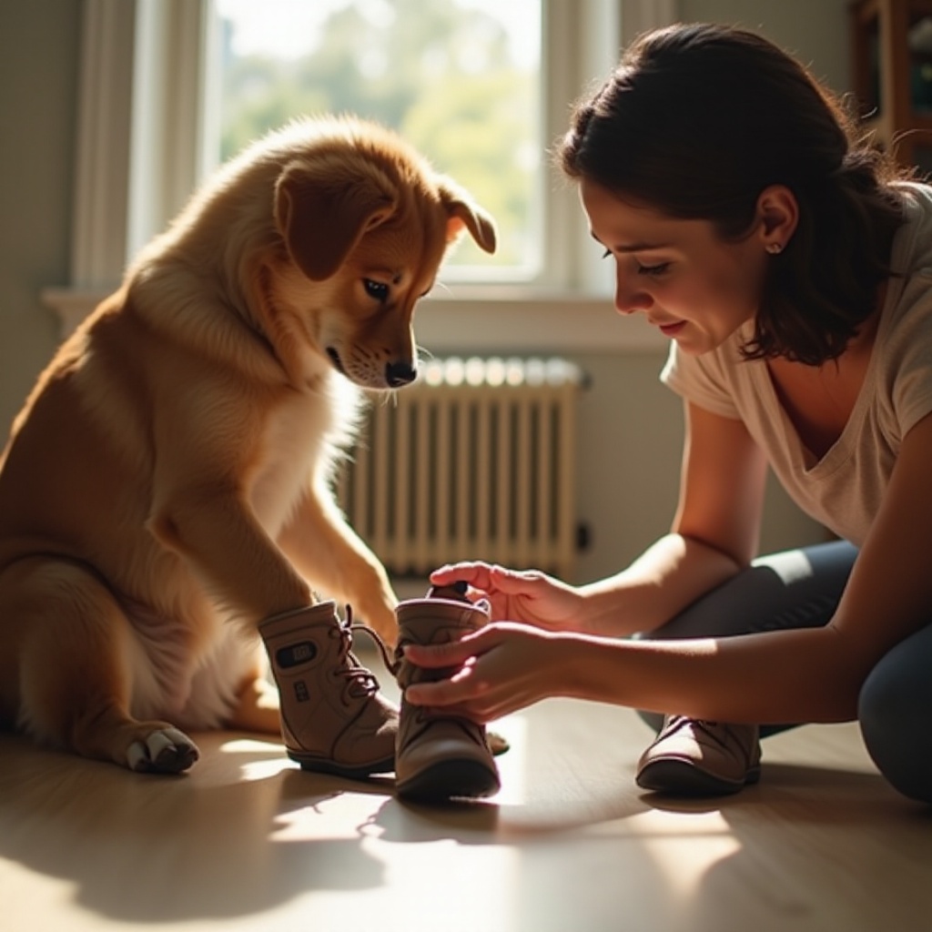 Позвольте собаке обнюхать и потрогать обувь в спокойной обстановке. Это знакомит её с новой экипировкой, уменьшая тревогу. -